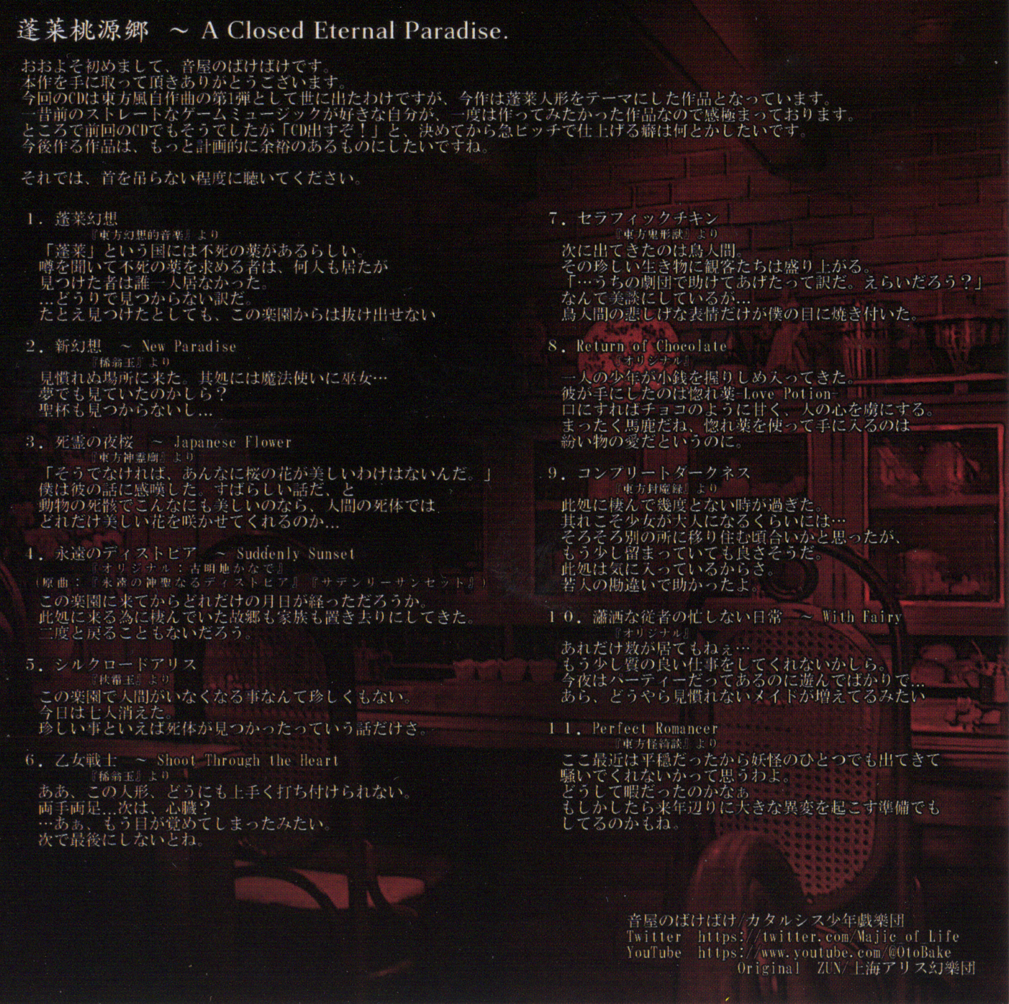 | - | 07 - セラフィックチキン.flac | 31001769 | | 音屋のばけばけ | 蓬莱桃源郷 ~ A Closed Eternal Paradise | 7 | 音屋のばけばけ | セラフィックチキン | 254.946667 | 972 | | flac | flac | | flac | 2024-02-03 17:39:38 |